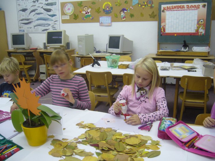 Das diesjährige Herbstfest der "Schlauen Füchse" stand unter dem Motto "Begegnung mit Bäumen". So sprachen wir darüber, welche Laubbäume bei uns in der Umgebung sehr häufig vorkommen und bestimmten die dazugehörigen Blätter und Früchte. Außerdem lernten wir dabei auch die unterschiedlichen Blattformen kennen. Einige Kinder erzählten, dass sie jetzt im Herbst auch Eicheln und Kastanien sammeln, um mitzuhelfen, die Waldtiere mit Futter zu versorgen. Nach der Gesprächsrunde löste jedes Kind die Aufgaben an den 4 vorbereiteten Stationen. So mussten wir zu dem Thema Rechenaufgaben lösen, schreiben, puzzeln und basteln. Jeder von uns gestaltete einen Igel mit Hilfe verschiedener Blätter. Das Basteln mit den Kastanien und Eicheln hat uns besonders Spaß gemacht. Viele waren dabei sehr kreativ und entwickelten phantasievolle Tiere, Menschen und andere Gestalten.