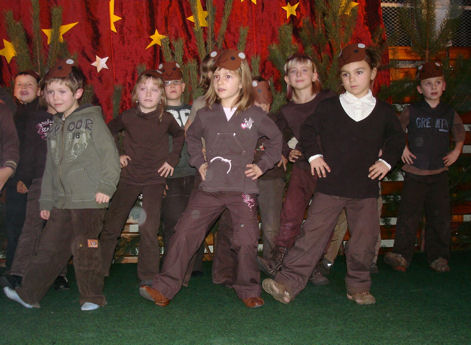 Am Freitagabend 18 Uhr war es wieder soweit und ca. 100 mitwirkende Kinder warteten auf den Beginn der Bärchenweihnacht in der liebevoll weihnachtlich geschmückten Turnhalle der Storkower Altstadtschule. Kein Platz blieb leer, da viele Eltern, Großeltern, Freunde und Bekannte gekommen waren, um zu sehen was die Kinder der Klassen 1a bis 3c einstudiert hatten. Doch bevor es so richtig losgehen konnte, nutzte die Grundschulkoordinatorin Frau Sabine Merschin und der Schulleiter der Storkower Europaschule Herr Ingolf Knobloch die Gelegenheit, um sich zu bedanken. Dieser Dank galt dem langjährigen rührigen Hausmeister Herrn Finke und Frau Turner, die für ihr Engagement bei der Bereitung und Organisation des Frühstücksprojekts an beiden Schulteilen geehrt wurde. Dann war es endlich soweit und Lili Ussat führte die Zuschauer als Erzählerin durch die Handlung. Sie konnten erleben wie sich die Tiere des Waldes auf das Weihnachtsfest vorbereiteten. Für besondere Stimmung sorgte hierbei der Schweinerock der Klasse 3a, aber auch der Bärentanz der Klasse 1a. Viel Text hatte Bärenmutter Bella - alias Nadine Müller zu lernen, den sie ohne Probleme darbot. Gemeinsam mit ihren Bärenkindern Isabel Ihrke, Lea Fischer und Lea Nawroth, sowie der Bärenfreundin Kimberley Lenz rettete sie das Weihnachtsfest für das einsame Bärchen - Alica Lademann, so dass zum Schluss alle Tiere gemeinsam Weihnachten feiern konnten. Auch der böse Wolf - alias Michelle Fiebig konnte überzeugt werden, sich zum Fest an den Früchten des Waldes zu erfreuen. Mit viel Applaus und einem Schokoladenbärchen ging für die Kinder ein aufregender Abend zu Ende. Der Dank der Grundschulkoordinatorin galt im Besonderen Frau Birgit Kammer, die für die gesamte Organisation verantwortlich war und natürlich allen Lehrern des Schulteils Altstadt, die mit ihren Schülern geprobt und geübt hatten, und auch dem Horterzieherteam, die nicht unwesentlich am Herstellen von Kostümen und Tiermasken beteiligt waren.