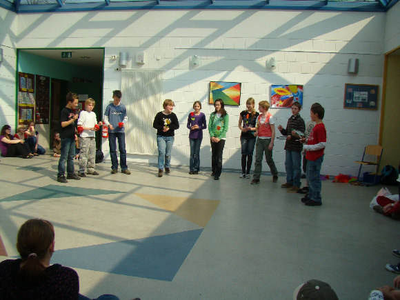 Wie in den vergangenen Jahren auch freuten sich am letzten Schultag vor den Osterferien die 5. Klassen auf ihr englisches Osterprojekt. Bedanken konnten sich die Schüler nach ca. fünf Stunden voller Abwechslung und Spaß in erster Linie bei ihrer Englischlehrerin Frau Wohlfahrt, die den Projekttag wie in den vergangenen Jahren vorbereitet und organisiert hat. Die Klassenlehrerinnen der drei 5. Klassen, Frau Gutjahr, Frau Lehnert und Frau Schrobbach, sowie Fremdsprachenassistentin Frau Schert gemeinsam mit Larissa Dahms und Janine Tennius aus der Klasse 9a und Englischlehrerin Frau Darimont unterstützten das Projekt, indem sie die verschiedenen Stationen betreuten. Ehe es am Morgen so richtig losgehen konnte, hatten Schülerinnen der 5a und 5b ein kleines Theaterstück, Gedichte und Lieder zur Einstimmung vorbereitet. Sie wurden mit einem englischen Certificate für ihre Mühe belohnt. In fünf Gruppen ging es dann von Station zu Station. Es wurde Osterschmuck gebastelt, Osterkarten am Computer erstellt und geschrieben, gesungen und eine eigene Choreographie erdacht, Sandwiches zubereitet und gegessen, gerätselt und gespielt. Am Ende präsentierte jede Gruppe ihre Choreographie des Osterliedes. Es war erstaunlich zu sehen, auf wie viel unterschiedliche Art und Weisen das Lied mit der Unterstützung von Instrumenten, Tüchern o.ä. dargeboten werden konnte. Diese Abschlusspräsentation wurde von allen mit viel guter Laune unterstützt und zufrieden über einen gelungenen Projekttag, konnten Schüler und Lehrer ein positives Fazit ziehen. Es hat viel Spaß gemacht und war abwechslungsreich, konnte man überall hören.