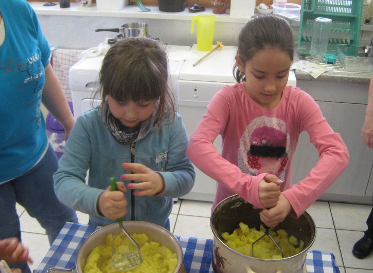 Im Sachkundeunterricht hatten sich die Kinder der Flex-Klasse "Helle Sterne" ausgiebig mit dem Thema "Gesunde Ernährung" beschäftigt. Wir tauchten ab in die Welt der Lebensmittel, untersuchten Geschmack und Aussehen und überprüften unsere eigenen Brotdosen im Hinblick auf ein ausgewogenes Schulfrühstück. Nun wollten wir selber unser Frühstück zusammen stellen, ein reichhaltiges Frühstücksbuffet anrichten und genussvoll gemeinsam speisen. Was eignet sich dazu besser als ein Projekttag, an dem wir fächerübergreifend lernen, die Wahrnehmungs- und Erlebnisfähigkeit steigern und uns das gemeinsame Tun in schöner Erinnerung bleibt? So zogen wir mit unseren eingekauften Nahrungsmitteln am 24.03.2015 voller Tatendrang ins "Friedensdorf Storkow", in dem wir ein ideales Ambiente für unseren Unterrichtstag der anderen Art fanden. Zunächst wurde der Plan für den Tag besprochen, denn nach dem selbst zubereiteten Frühstück wollten wir auch noch ein leckeres Mittagessen mit guten Zutaten selber zaubern. In intensiver Gruppenarbeit ging es zunächst ans Anrichten des Buffets, ans Decken der Tische und Wiederholen der wichtigsten Tischmanieren. Keiner vermisste das Toastbrot mit Schokoaufstrich und die Limonade. Auf einmal schmeckten auch ein Vollkornbrötchen mit Käse und frische Milch. Unsere Helferinnen Frau Kvarnström, Frau Przybyschewski, Frau Volmer und Frau Koch, unsere Horterzieherin, standen aber schon in den Startlöchern, denn die erfahrenen Hausfrauen waren bezüglich unserer Kochkunst doch noch etwas besorgt. Ganz eifrig ging es dann ans Schälen, Schnippeln, Kochen, Panieren, Würzen, Stampfen, Abschmecken, Rezepte lesen und Braten. Dabei hatten wir so viel Spaß am Verarbeiten der Lebensmittel, am Umgang mit den Küchengeräten und Beobachten, wie aus frischen Zutaten Kartoffelbrei, Möhrengemüse und ein knuspriges Hähnchenschnitzel wird, dass wir gar nicht merkten, wie die Zeit verging. Dank der tatkräftigen Unterstützung unserer erwachsenen Köchinnen stand dann auch pünktlich zur Mittagszeit das Essen auf dem Tisch. Jetzt wissen wir, die "hellen" Sterneköche, dass selber Kochen und gemeinsames Essen viel Spaß machen kann und viele Köche den Brei wirklich nicht verderben.