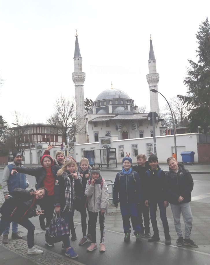 Andere Religionen kennen lernen um Verständnis zu wecken und dialogfähig zu werden, das ist eines der Bildungsziele des Evangelischen Religionsunterrichts. So machten sich am Mo, 2.3. 2020 10 Schüler und Schülerinnen auf, den Islam aus erster Hand zu erleben: Wir fuhren mit Bahn und Bus nach Berlin Neukölln zur Sehitlik- Moschee. Beim letzten Stück im fast leeren Obergeschoss des Doppeldecker-Busses sahen wir sie schon: Imposant mit ihrer Kuppel und den 2 Minaretten, eingebettet von großen Bäumen – und die Vorfreude auf die Begegnung wuchs. Kurze Zeit später betraten wir türkischen Boden: Das Gelände der Moschee mit zugehörigem Diplomatenfriedhof gehört zur Türkei.