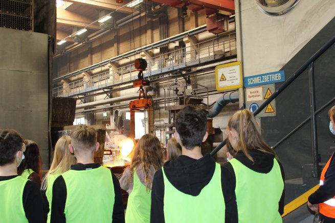 Im Wat-Unterricht Klasse 7 lernten die Schüler das Sandformgießen als ein wichtiges Fertigungsverfahren kennen. Ein Modellversuch diente im Unterricht dazu das Gießen praktisch zu zeigen. Um zu sehen, wie Teile in der Produktion gegossen werden, machte die Klasse 7a eine Exkursion in der Firma Duktil Guss Fürstenwalde GmbH. Wir fuhren mit dem Rad von der Schule bis in die Firma, was für einige Schüler nach der Home – Office Zeit eine große Herausforderung war. Frau Lutter hat uns aber pünktlich zum Besuchstermin bei Duktil empfangen können. Nach einer Einweisung zum Verhalten auf dem Gelände ging es in den Konferenzraum, wo wir vom Angestellten der Produktion, Konstruktion, Verwaltung und Auszubildenen herzlich begrüßt wurden. Die Betriebsbesichtigung begann mit einer Präsentation und Vorstellung der Personen und Abteilungen. Die Schüler sind mit Getränken und Naschereien umfangreich versorgt wurden. Viele Informations- und Werbematerialien lagen für die Schüler zum mitnehmen bereit. In zwei Gruppen aufgeteilt ging es dann durch die Produktionshallen von Duktil. Viele neue und interessante Eindrücke nahmen die Schüler auf ihren Rundgang mit. Besonders in Erinnerung ist der Abstich der Schmelze bei Temperaturen um 1500°C geblieben. Erstaunt waren die Schüler über die Lautstärke in den verschiedenen Hallen und wie viele verschiedene Gussformen in den Hallen lagern. Im Rundgang konnten sich die Schüler die einzelnen Arbeitsschritte von der Konstruktion bis zu Fertigung und Kontrolle ansehen. Während des Rundgangs stellten die Schüler bereits viele Fragen. Nach dem Rundgang hatten die Schüler nochmals die Möglichkeit im Konferenzraum Fragen zur Firma und Ausbildung zu stellen.