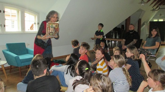 Sie erzählte uns ein ukrainisches Märchen von Kullerkorn, der das Glück suchte so spannend, dass es mucksmäuschenstill war und wir eine Stunde zuhörten, aber auch mitmachten, wenn Kullerkorn Hilfe brauchte.