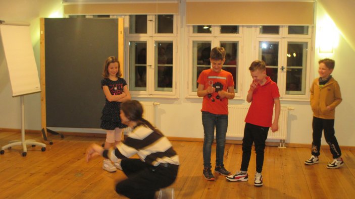Nach der Pause mit leckeren Hotdogs, Gemüsesticks und Gustavs Würstchen im Schlafrock (vielen Dank an unsere Eltern) versuchten wir selbst, in kleinen Gruppen Märchen einzuüben. Wir führten sie uns gegenseitig vor und jede Gruppe bekam den verdienten Applaus.